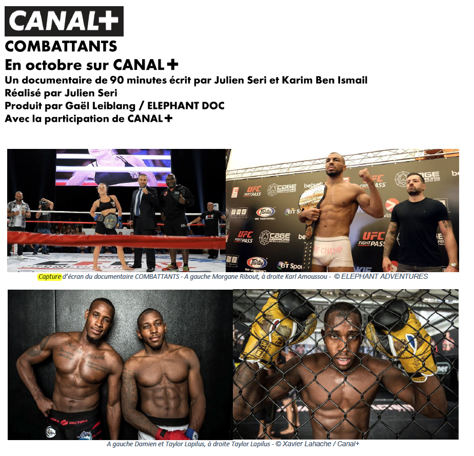 Co-écrit avec Karim Ben Ismail et réalisé par Julien Seri, « COMBATTANTS », est un documentaire de 90 minutes sur l’univers du MMA. Il sera diffusé mi-octobre sur CANAL+.