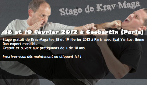 Stage gratuit de Krav-Maga les 18 et 19 février 2012 à Paris (Stade Pierre de Coubertin) avec Eyal Yanilov, 8ème Dan expert mondial. Gratuit et ouvert aux pratiquants de + de 18 ans. Tous les renseignements en cliquant ici